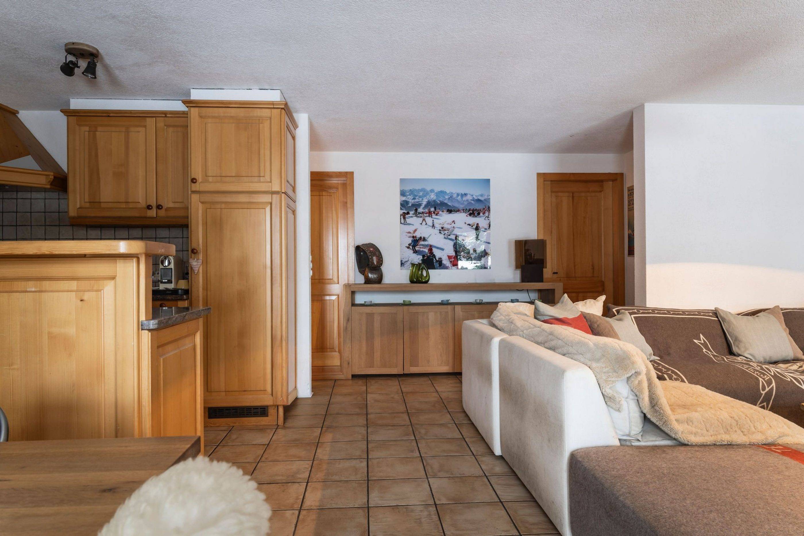 Au dernier étage, on trouve un salon chaleureux avec une cheminée en pierre ollaire et une cuisine ouverte spacieuse attenante à la salle à manger. Ce niveau comprend également la chambre principale avec sa salle de bains privative, une terrasse et une mezzanine pouvant être aménagée en bureau.