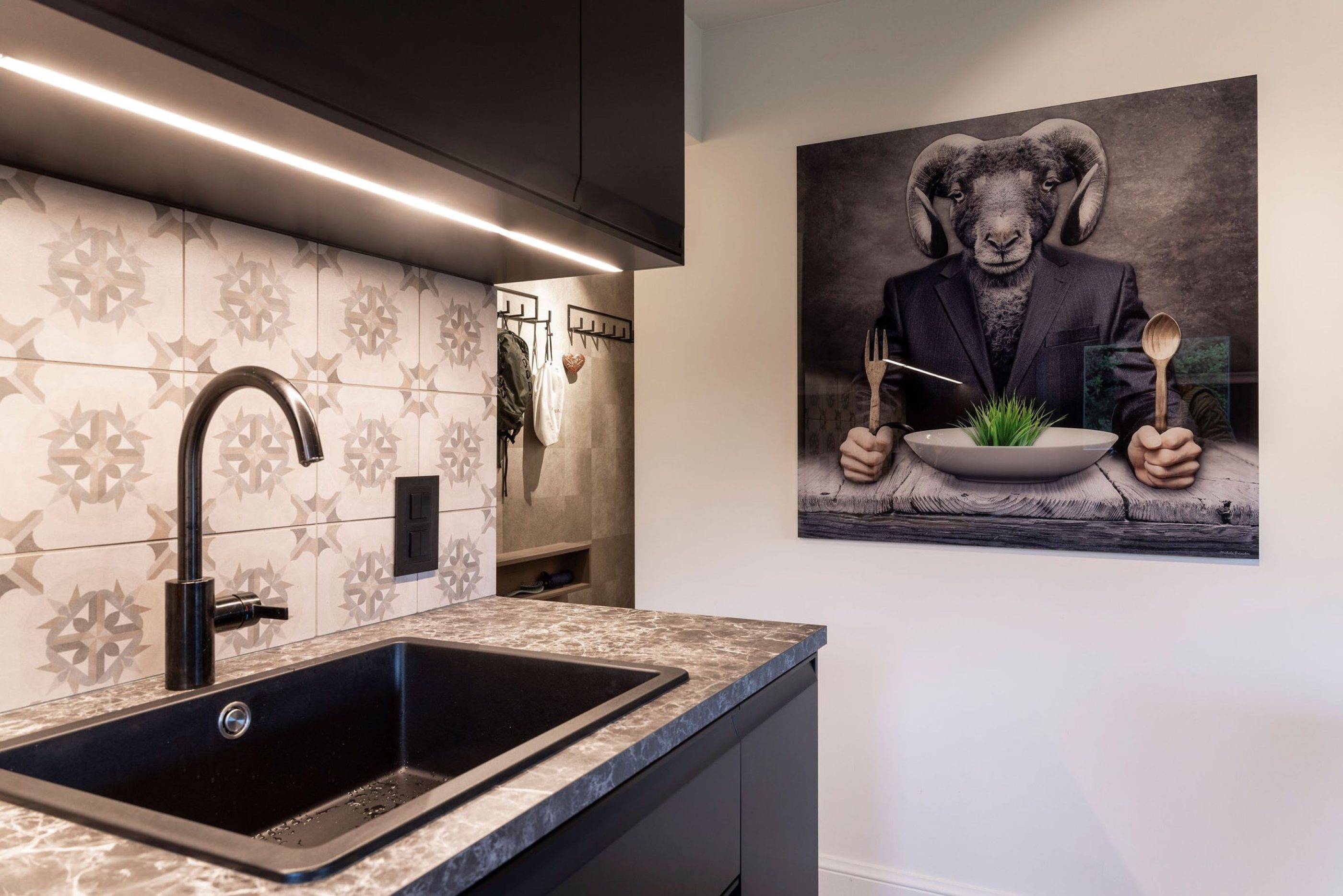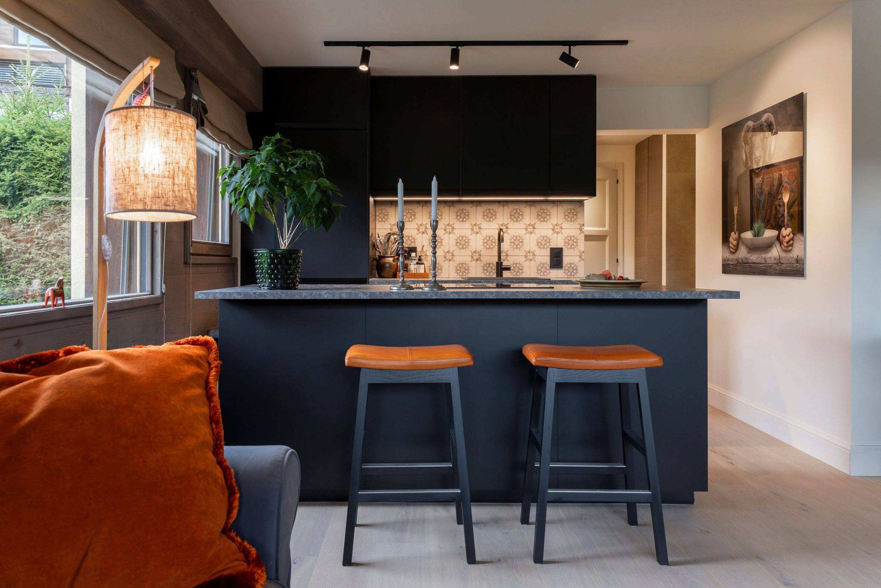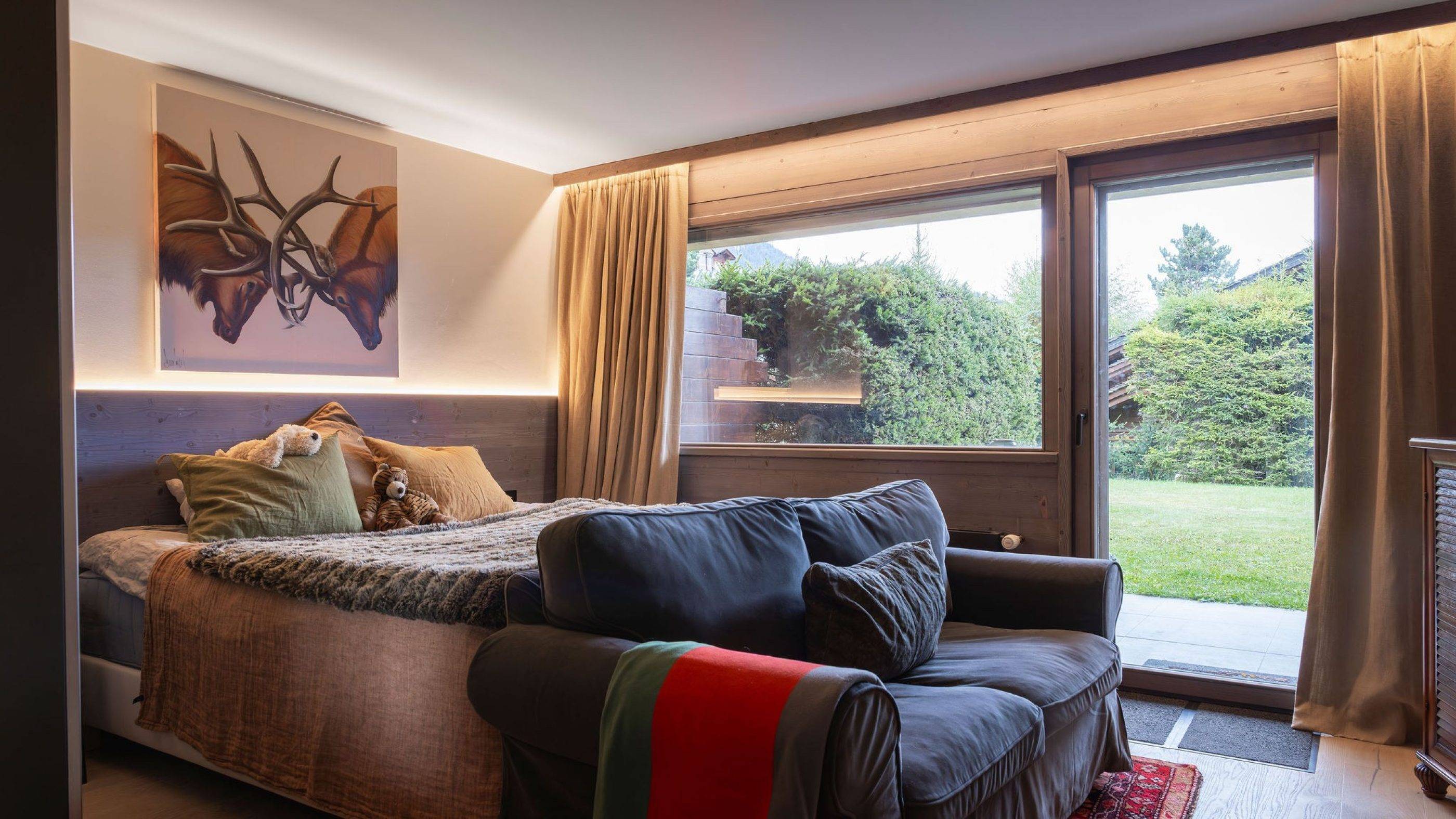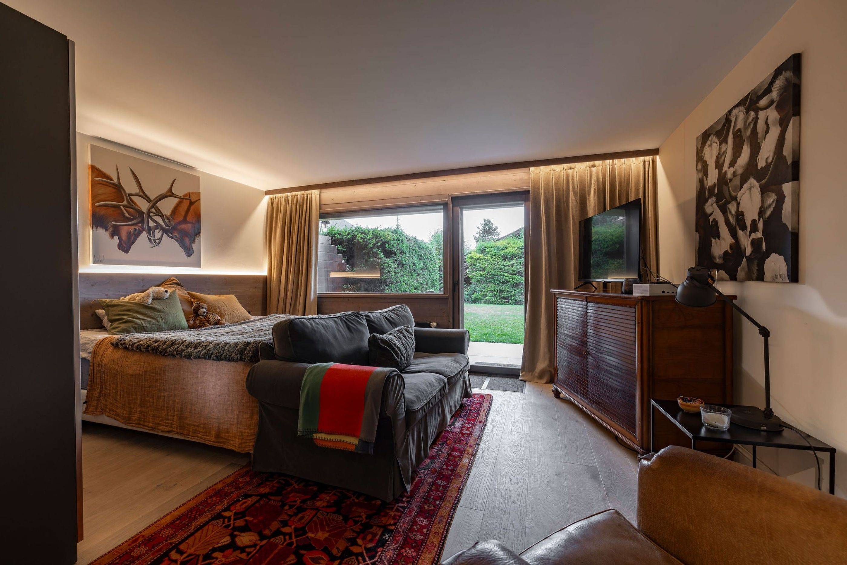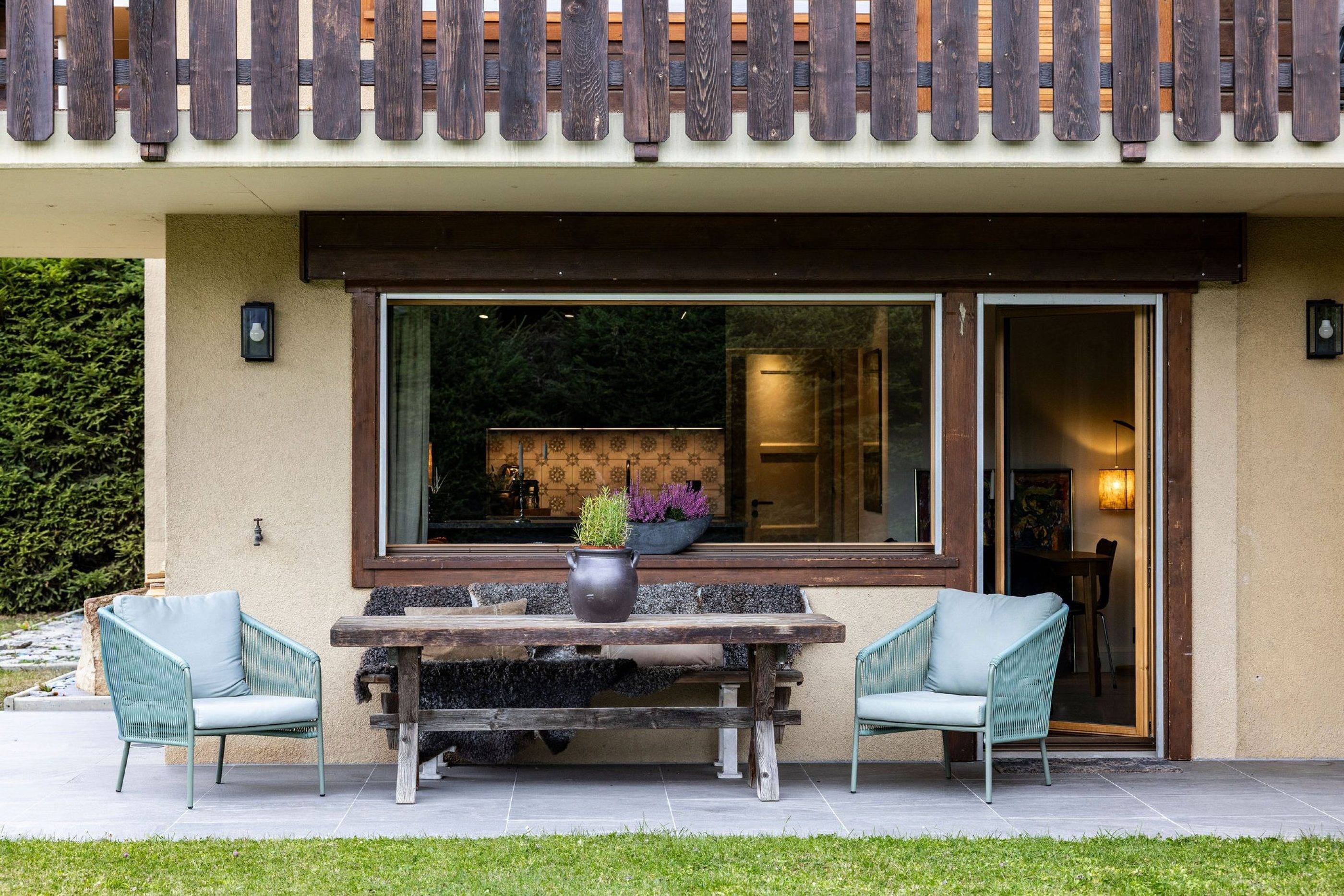 Un studio au rez-de-chaussée et un appartement de deux chambres, tous deux équipés de cuisines et de salles de bains modernes, présentent des intérieurs confortables aux teintes chaleureuses et offrent de superbes vues sur les montagnes environnantes.