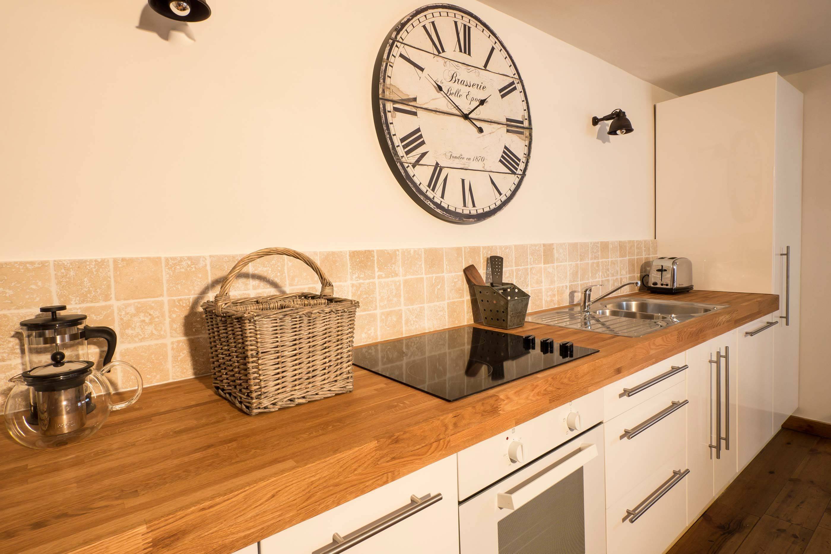 Une cuisine ouverte avec une petite salle TV séparée fournit un large espace tout en restant un lieu chaleureux et douillet pendant les mois d’hiver froids.