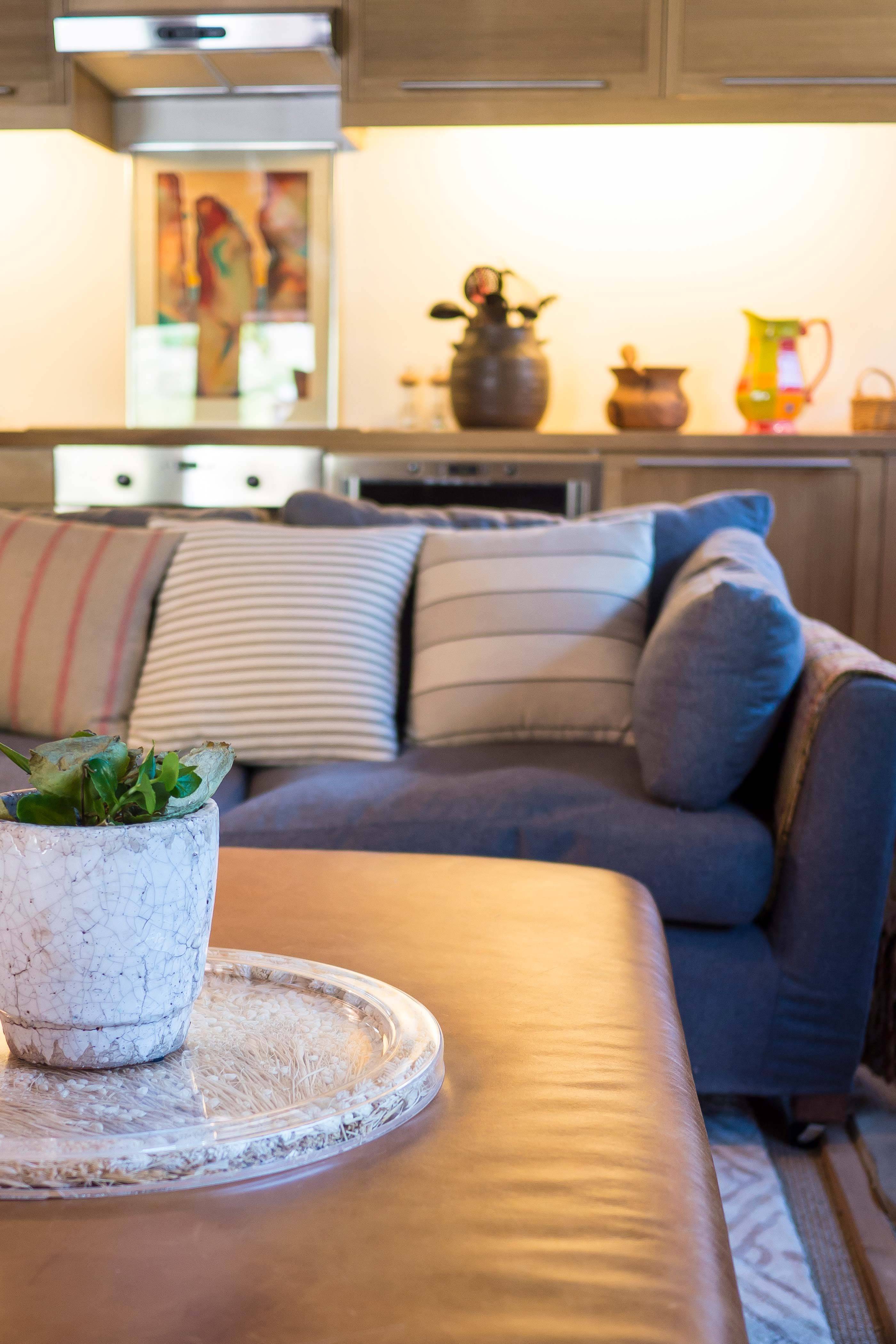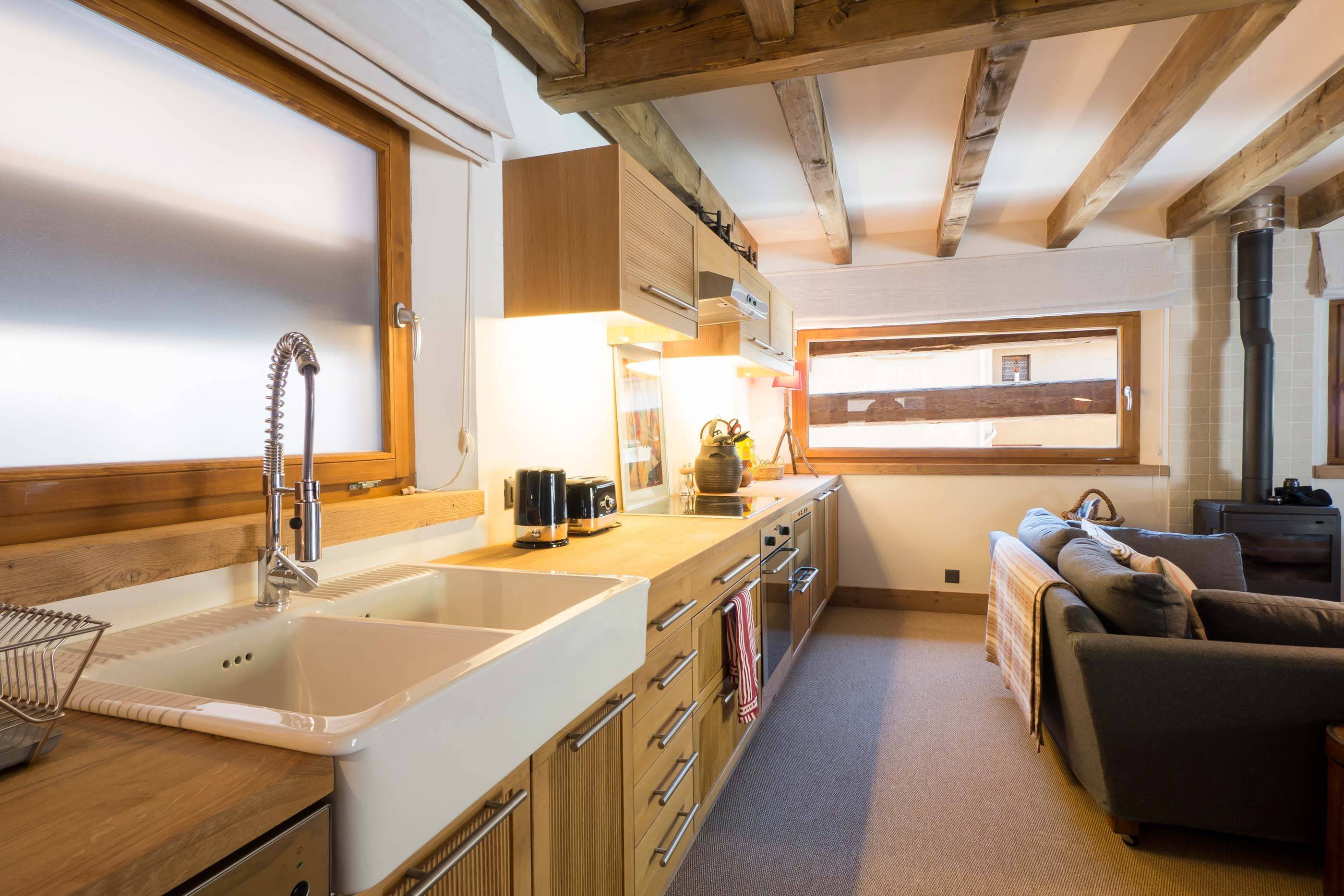 Au rez-de-chaussée surélevé se situe la cuisine tout équipée ainsi qu’un salon-salle à manger ouvert. Le poêle à bois fait de cet espace le lieu de villégiature le plus confortable et le plus accueillant que l'on puisse espérer.