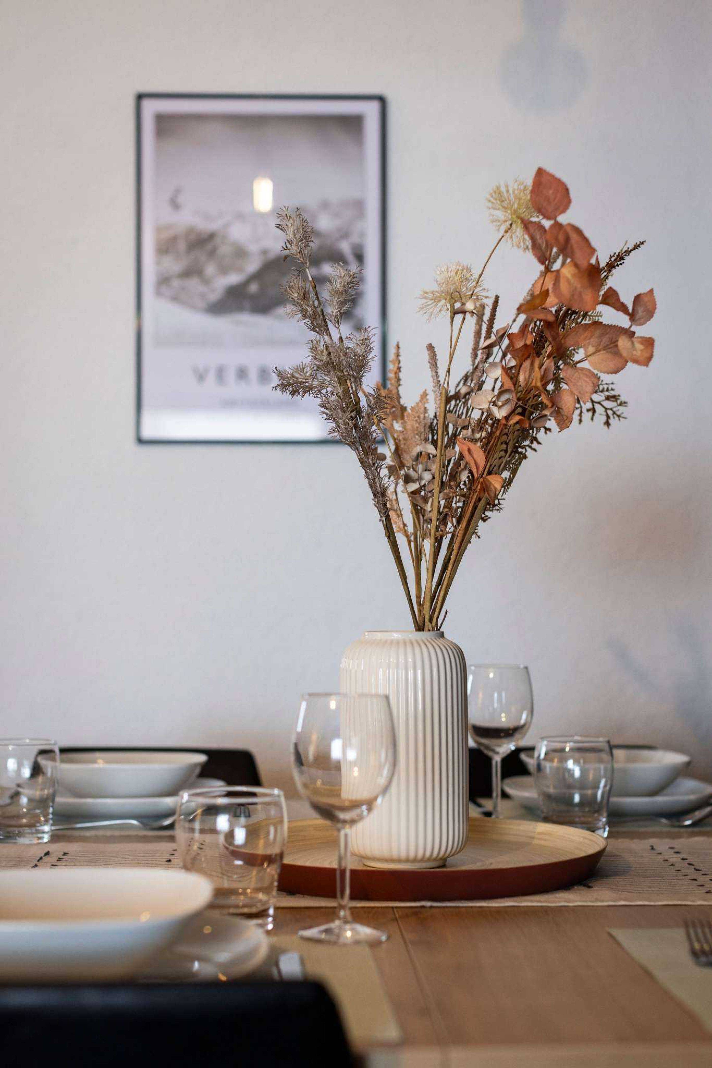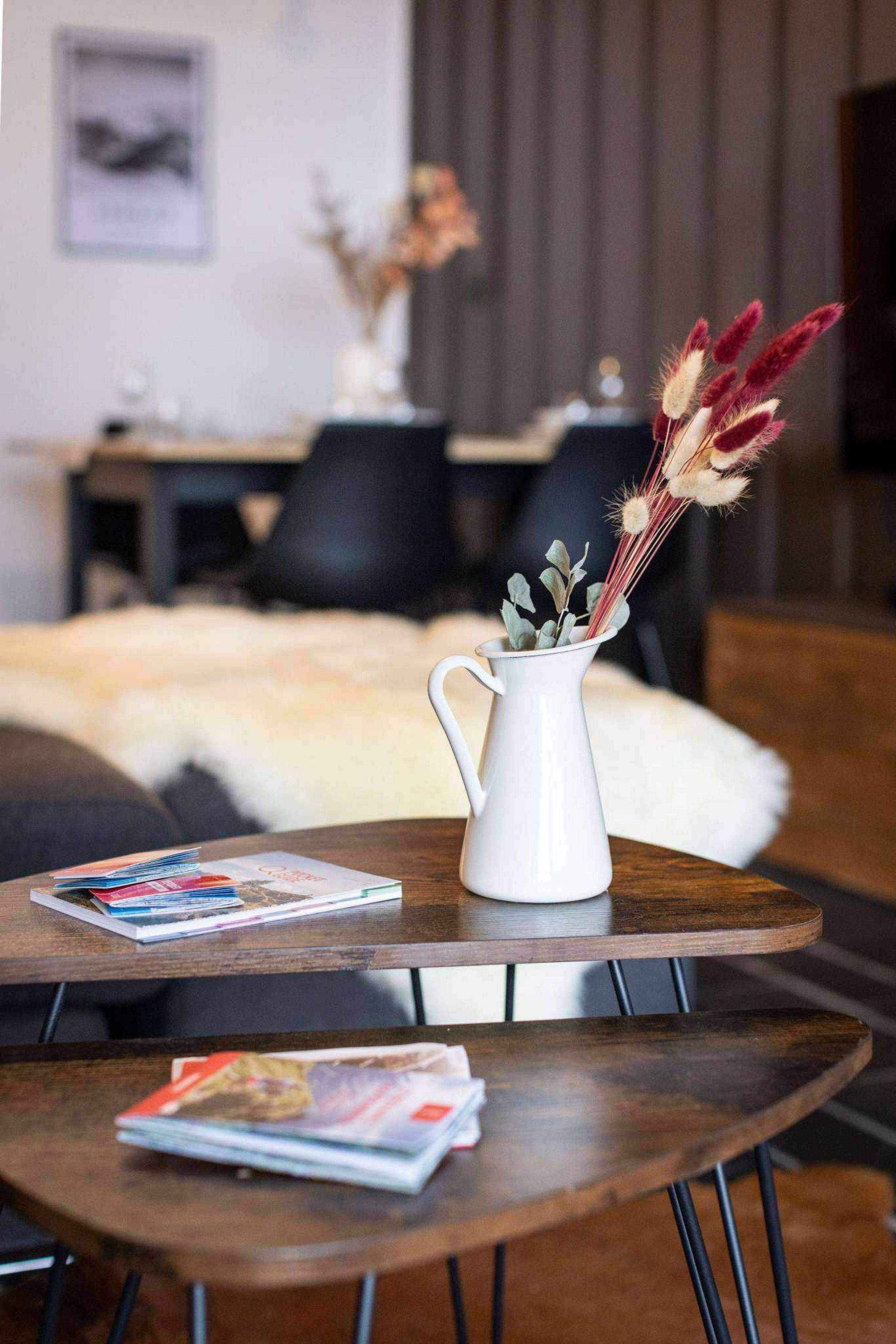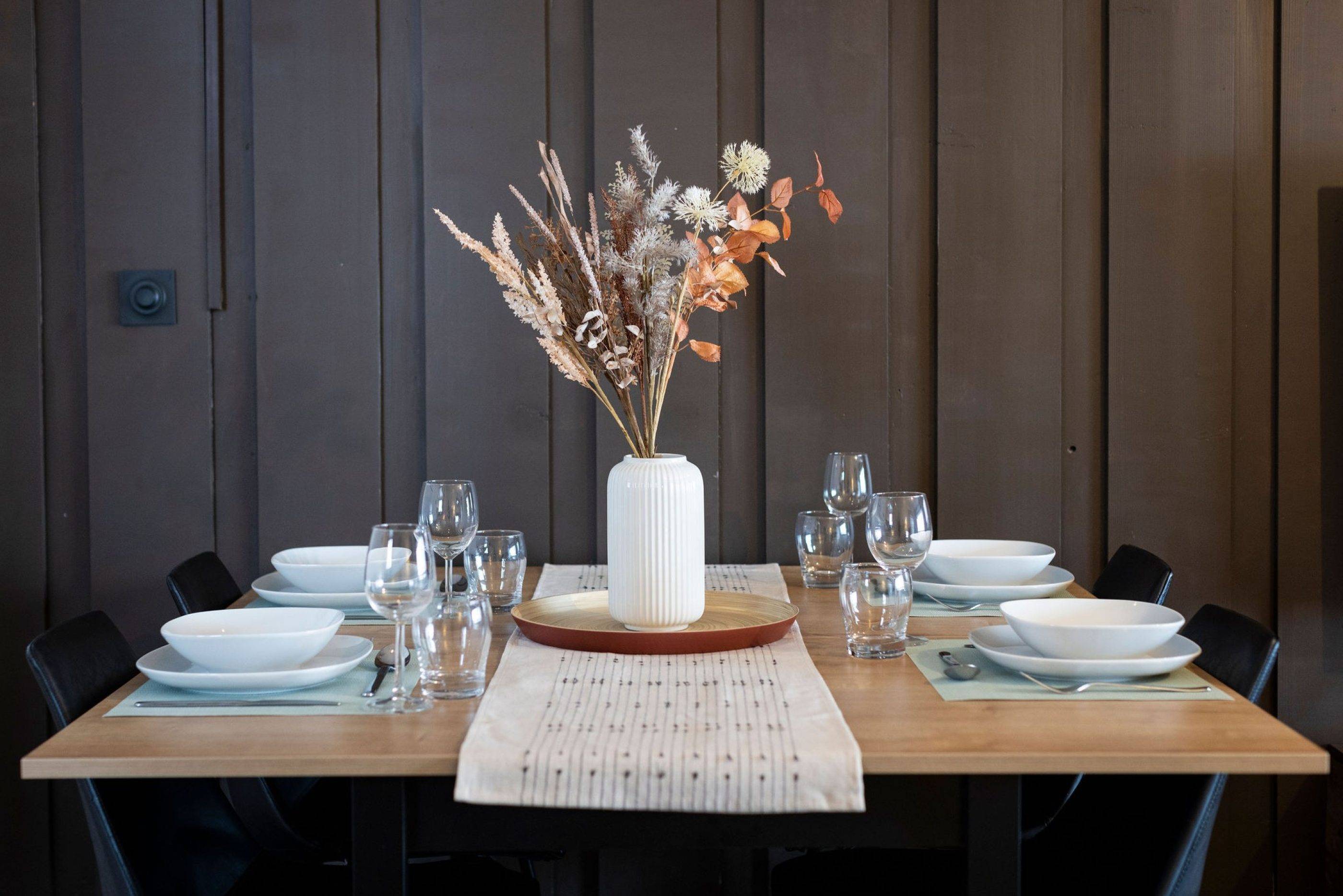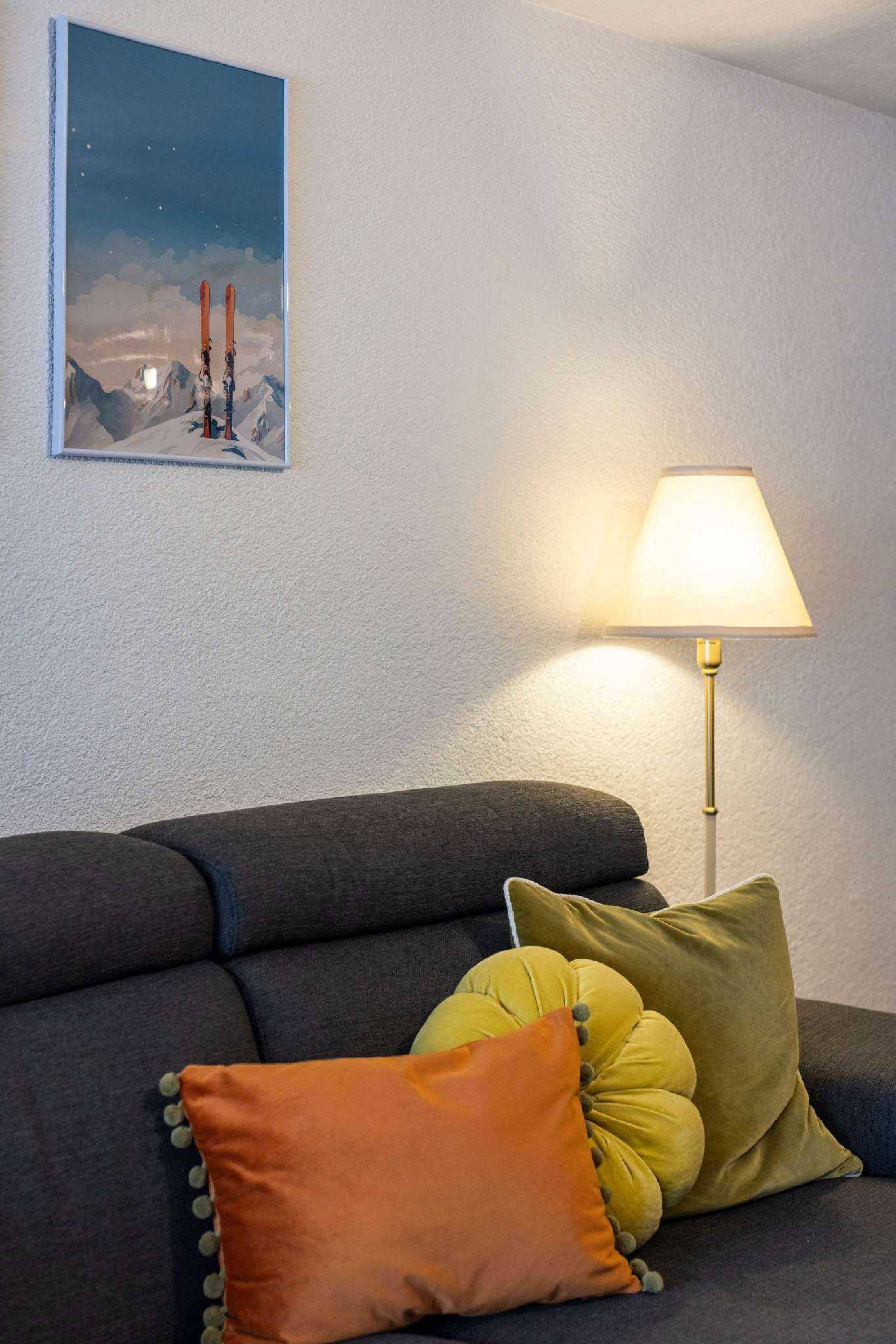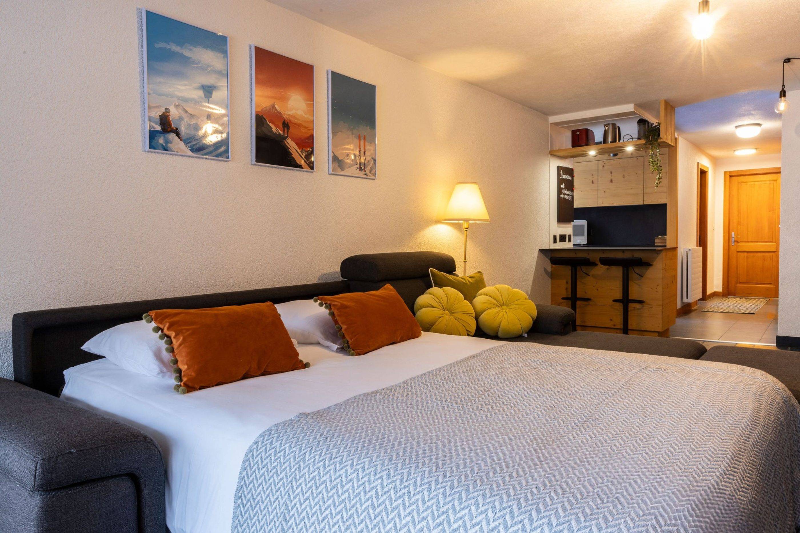 La cuisine ouverte mène à une salle à manger accueillante avec une grande table pour quatre personnes, ainsi qu'à un salon confortable équipé d'un canapé d'angle convertible. Ce canapé est parfait pour recevoir jusqu'à deux invités supplémentaires ou pour se détendre après une journée passée sur les pistes ou à explorer les sentiers.