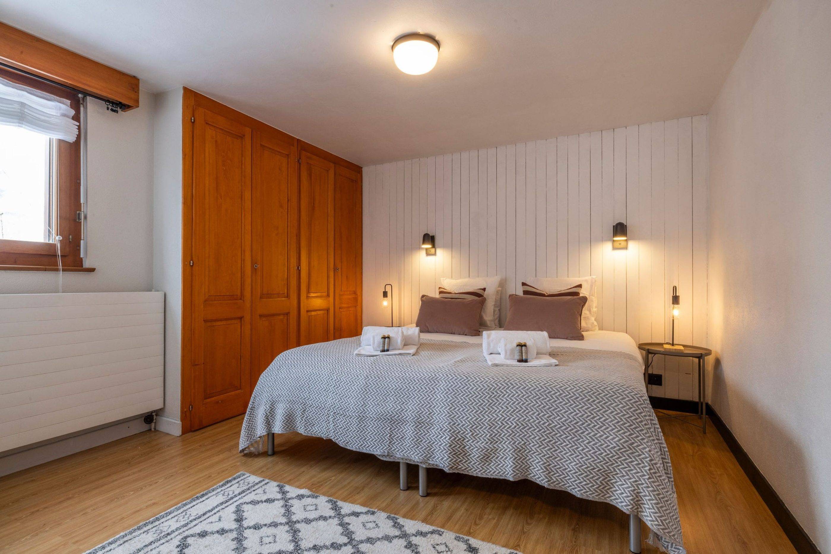 La chambre double confortable est dotée d'un lit king-size et de nombreux rangements, tandis que la salle de bains comprend une baignoire pour un confort optimal.