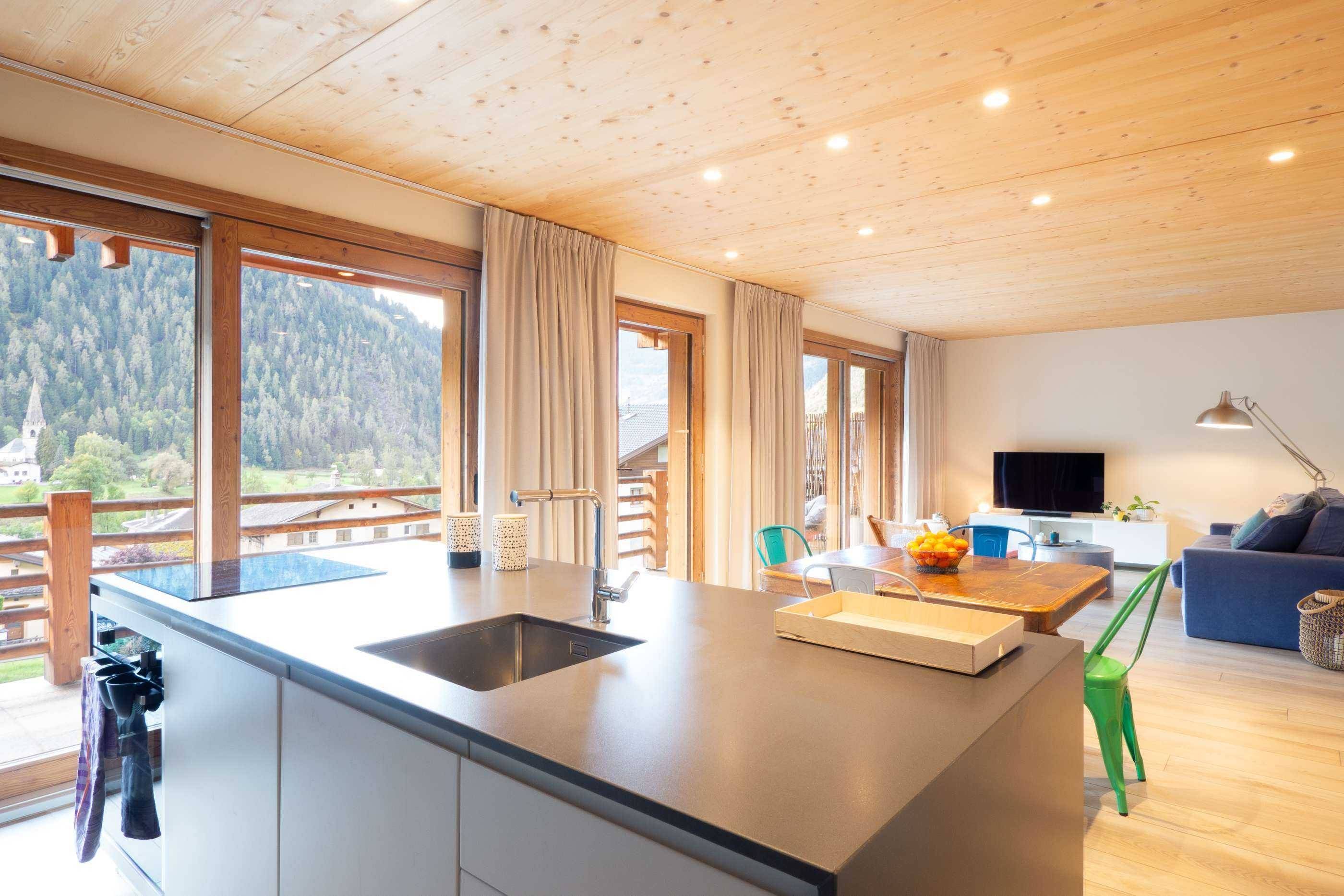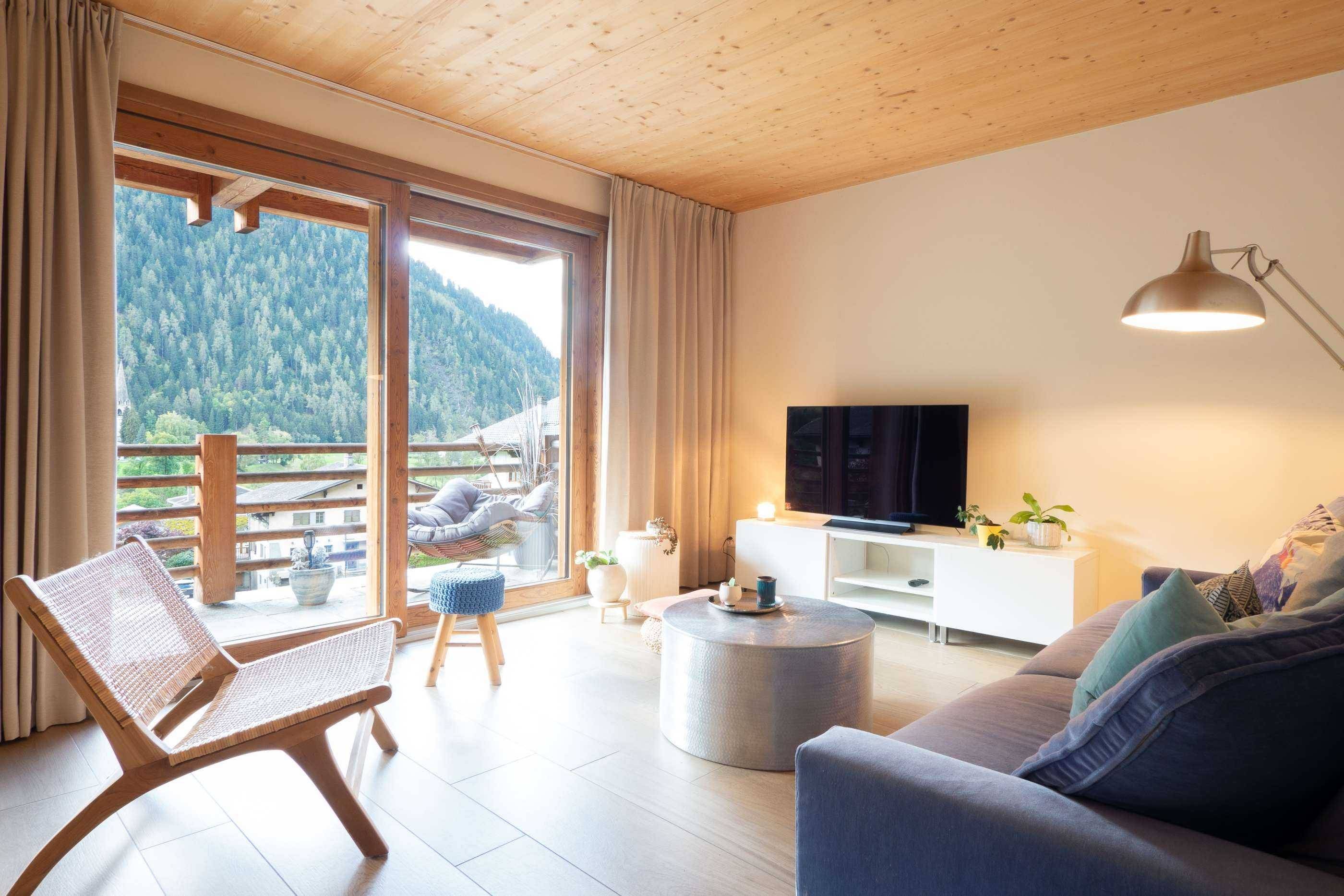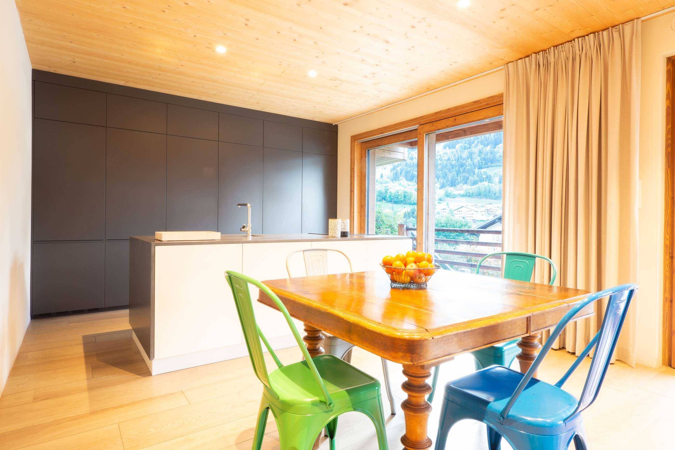 The living room includes a convertible sofa, perfect for accommodating up to two extra guests (for an extra CHF25 per night per person), and a Smart TV for your entertainment needs. Step outside onto the large sunny balcony and enjoy the stunning mountain views !