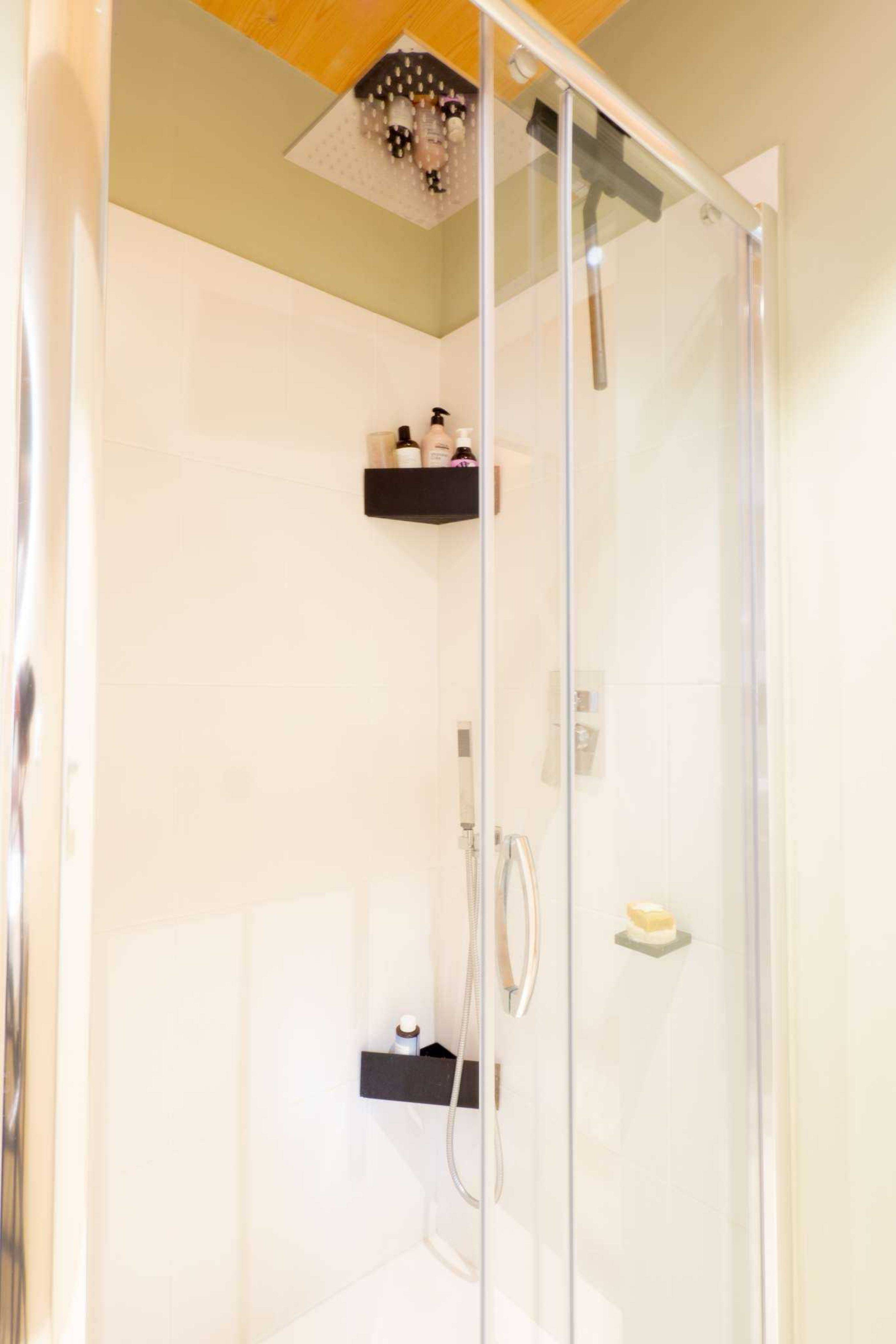 The bedroom features a spacious double bed with a high-quality mattress for restful nights, while the bathroom includes a bathtub and shower. An outdoor shower, perfect for warm days, adds an extra touch of fun.