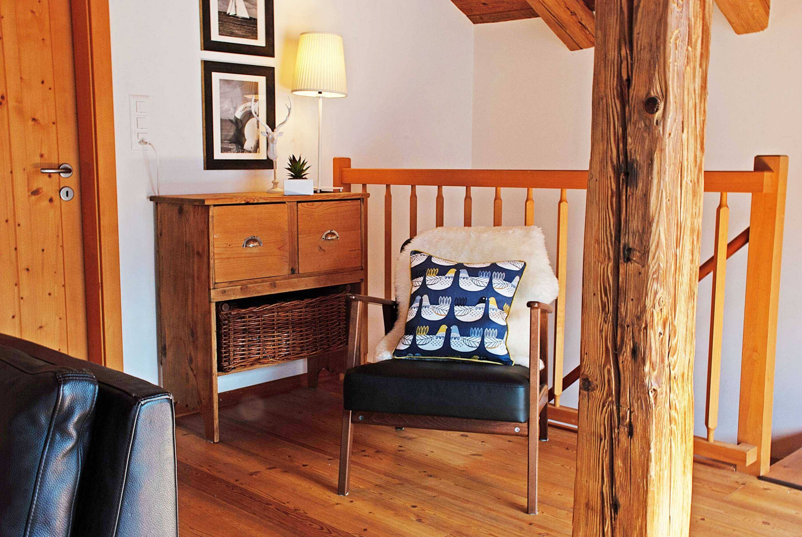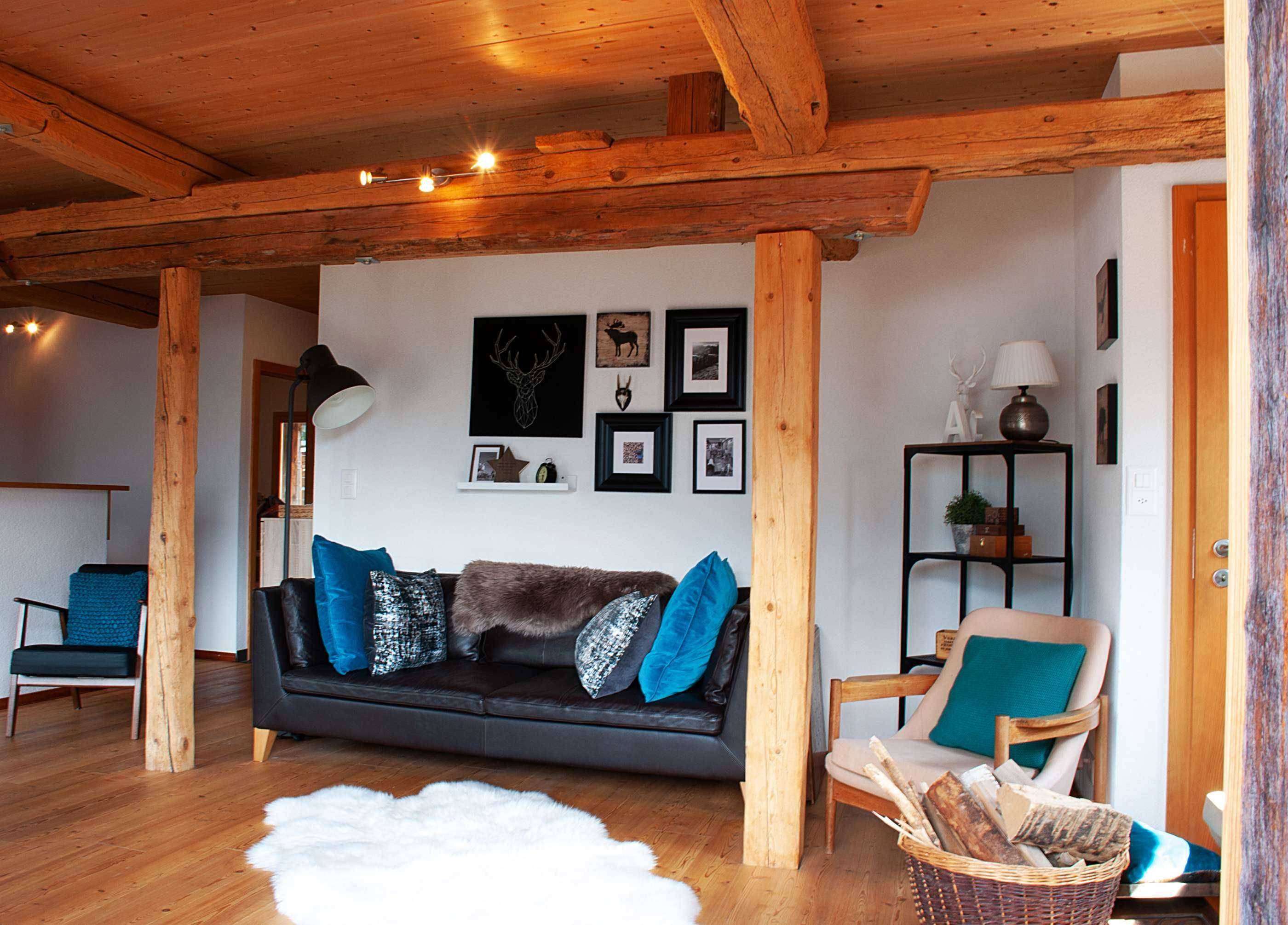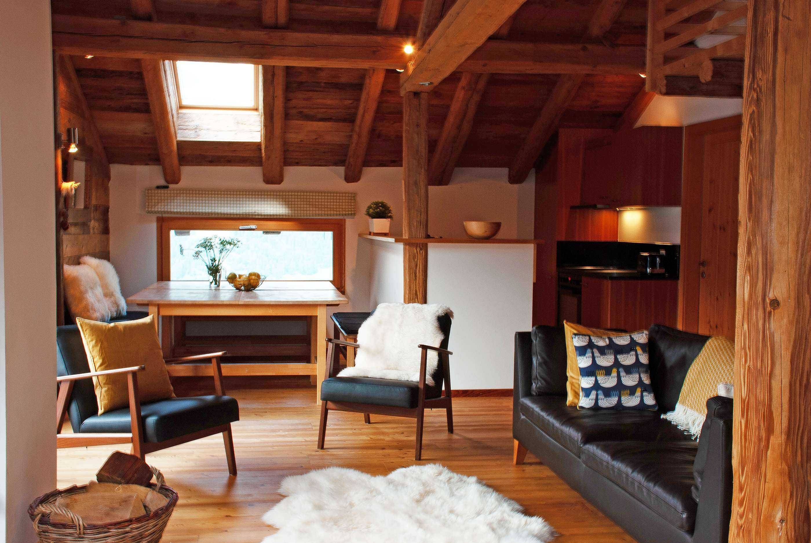 The bottom apartment has a similar layout to the upper with the living area on the south side and a bedroom and bathroom on the north. A cosy chalet feel is retained with more exposed beams, a wood burner and a large south facing balcony. Stairs go down to a lower level containing 2 further bedrooms, a bathroom and technical room.