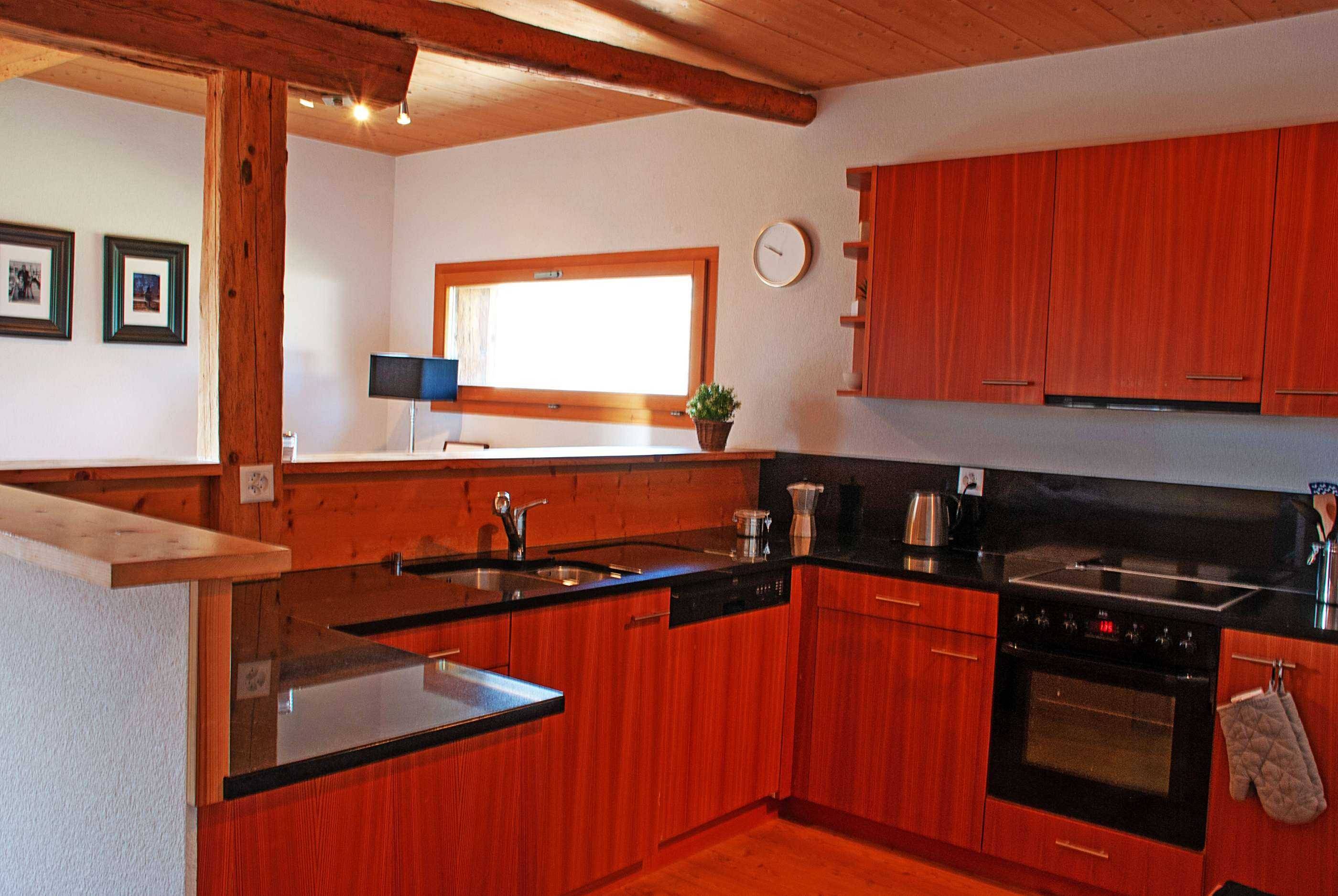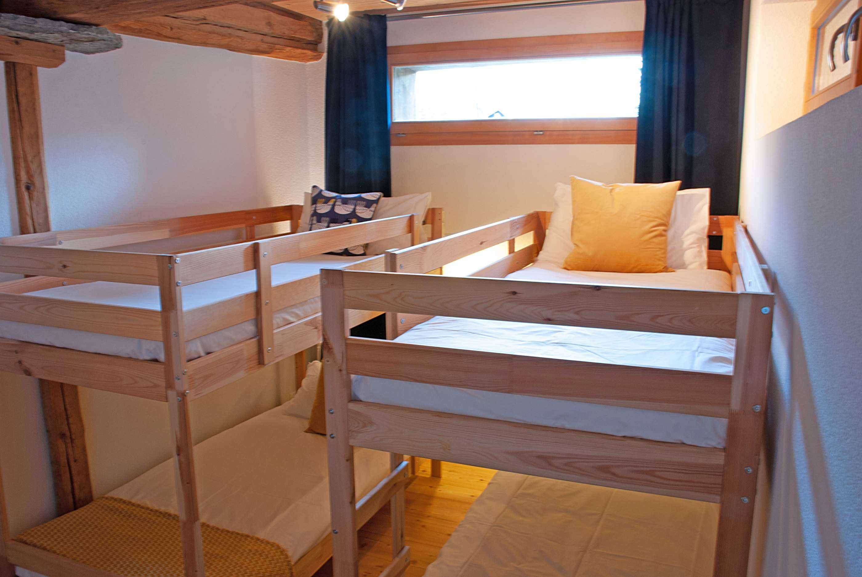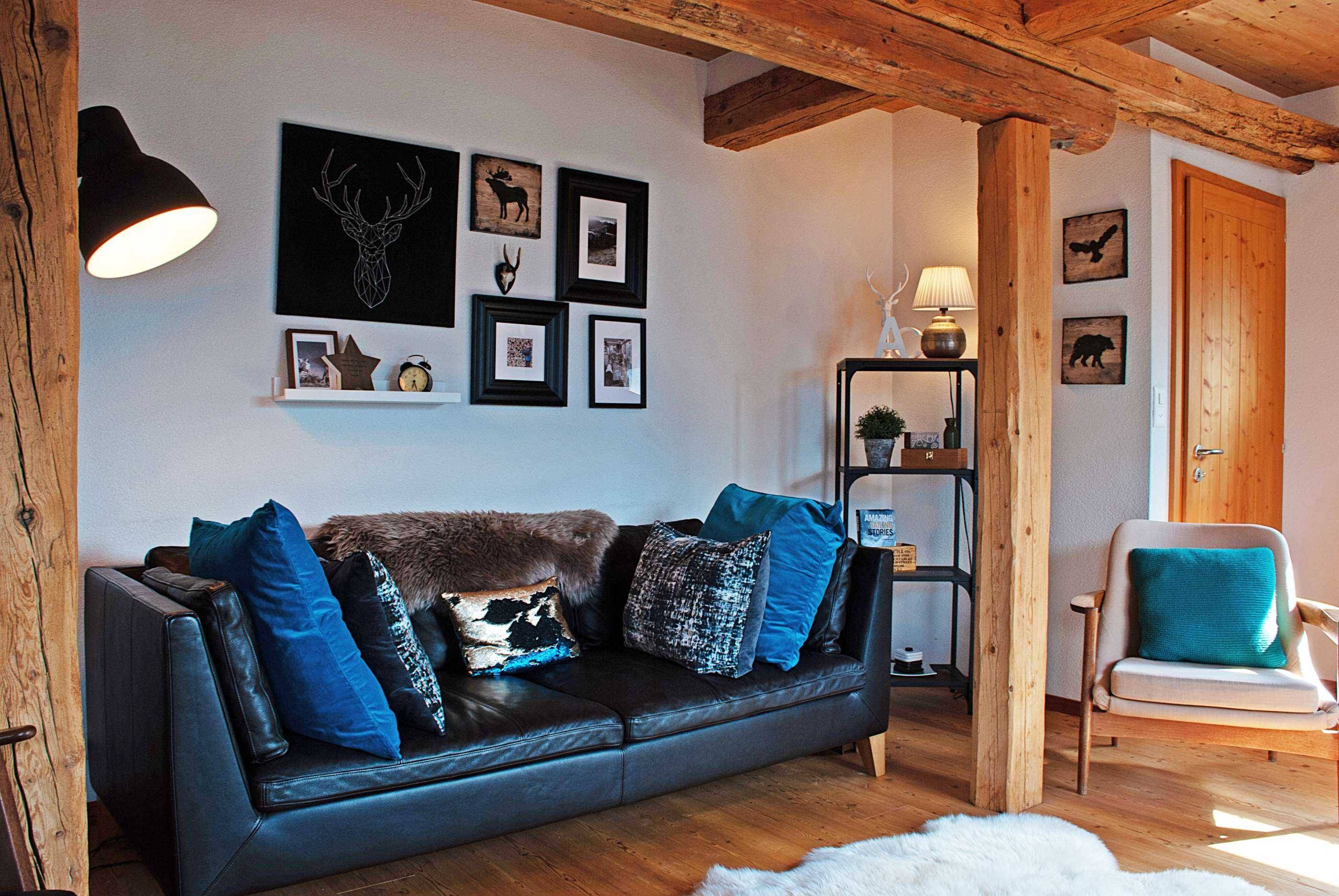 The bottom apartment has a similar layout to the upper with the living area on the south side and a bedroom and bathroom on the north. A cosy chalet feel is retained with more exposed beams, a wood burner and a large south facing balcony. Stairs go down to a lower level containing 2 further bedrooms, a bathroom and technical room.
